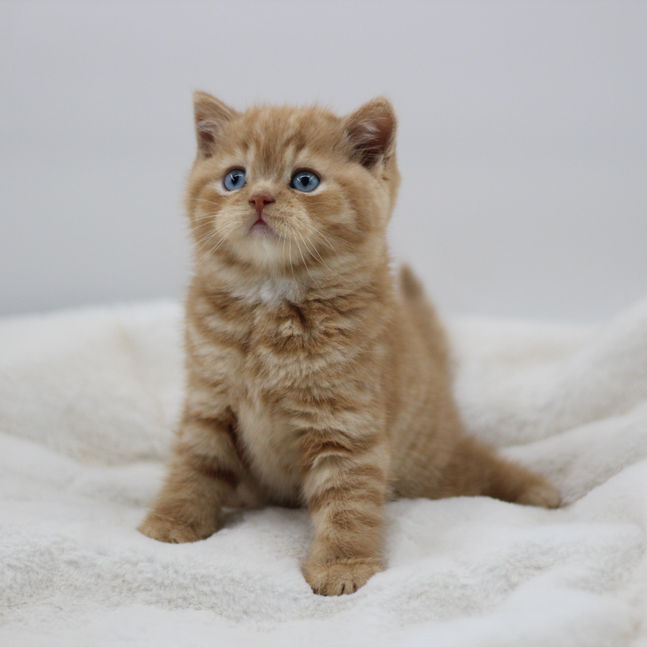 Zander is a male red mackerel tabby Scottish Straight male. He will have blue eyes as an adult. He was born on November 20th, 2024 will be ready to go to his new home in late March. Zander will be neutered, up-to-date on vaccinations, microchipped, and comes with a 5-year genetic health guarantee.